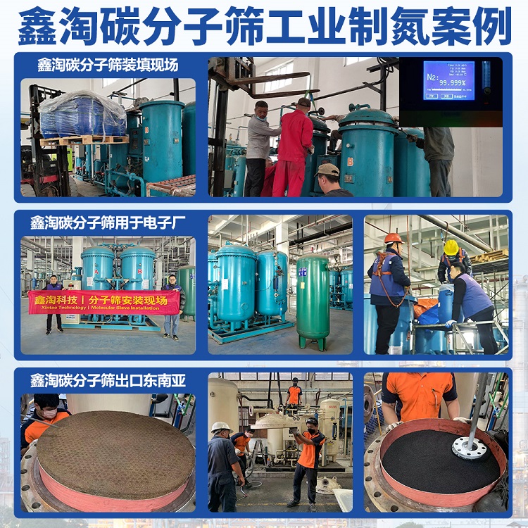鑫淘公司的CMS系列碳分子筛的主要成分为元素碳,外观为黑色柱状固体。因含有大量直径为4埃德微孔,这些微孔允许小于其孔径的分子快速进入,而限制大于其孔径的分子进入,且该微孔对氧分子的瞬间亲和力较强,可用来分离空气中的氧气和氮气,工业上利用变压吸附装置(PSA)制取氮气。鑫淘碳分子筛制氮量大、氮气回收率高,使用寿命长,适用于各种型号的变压吸附制氮机,是变压吸附制氮机的首选产品。