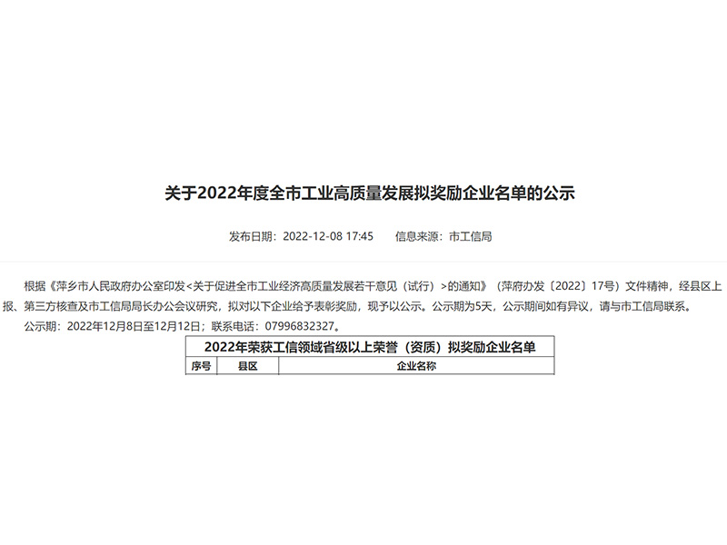 根据《萍乡市人民政府办公室印发<关于促进全市工业经济高质量发展若干意见(试行)>的通知》(萍府办发〔2022〕17号)文件精神,经县区上报、第三方核查及市工信局局长办公会议研究,拟对江西鑫淘科技股份有限公司给予表彰奖励。
