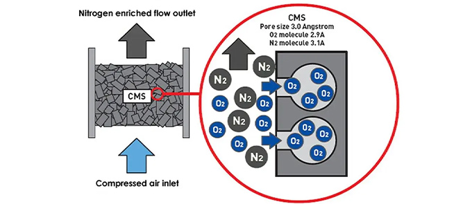碳分子筛利用筛分氧和氮的特性。当分子筛吸附杂质气体时,大孔和中孔只起通道的作用,将吸附的分子输送到微孔和亚微孔,而微孔和亚微孔是真正起吸附作用的体积。