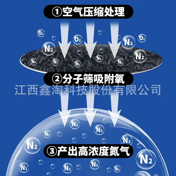 空气中的氧气(O₂)分子直径约0.28nm,氮气(N₂)分子直径约0.30nm,二者直径差异微小,但极性与扩散特性截然不同。碳分子筛的微孔结构对分子扩散速率具有 “筛选作用”:氧气分子极性更强,且分子直径略小,能快速突破碳分子筛微孔的 “扩散壁垒”,在加压环境下迅速进入微孔内部被吸附固定;氮气分子极性弱、直径稍大,扩散速率比氧气慢,在相同加压条件下,大部分氮气分子无法及时进入微孔,只能沿着碳分子筛颗粒间的间隙穿过吸附床层,成为初步富集的 “粗品氮气”。这种 “氧气快吸附、氮气慢通过” 的动力学差异,是碳分子筛实现氮氧分离的核心逻辑。