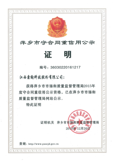 2016年12月26日,公司获得萍乡市市场和质量监督管理局2015年度守合同重信用公示资格,已在萍乡市市场和质量监督管理局网站公示。