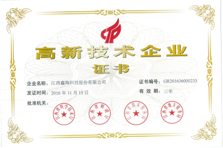 根据国家《高新技术企业认定管理办法》和《高新技术企业认定管理工作指引》的相关规定,鑫陶科技被认定为国家级高新技术企业。近日,公司收到了由江西省科学技术厅、江西省财政厅、江西省国家税务局、江西省地方税务局联合颁发的“国家高新技术企业”认定证书,由此正式迈入国家高新技术企业行列。